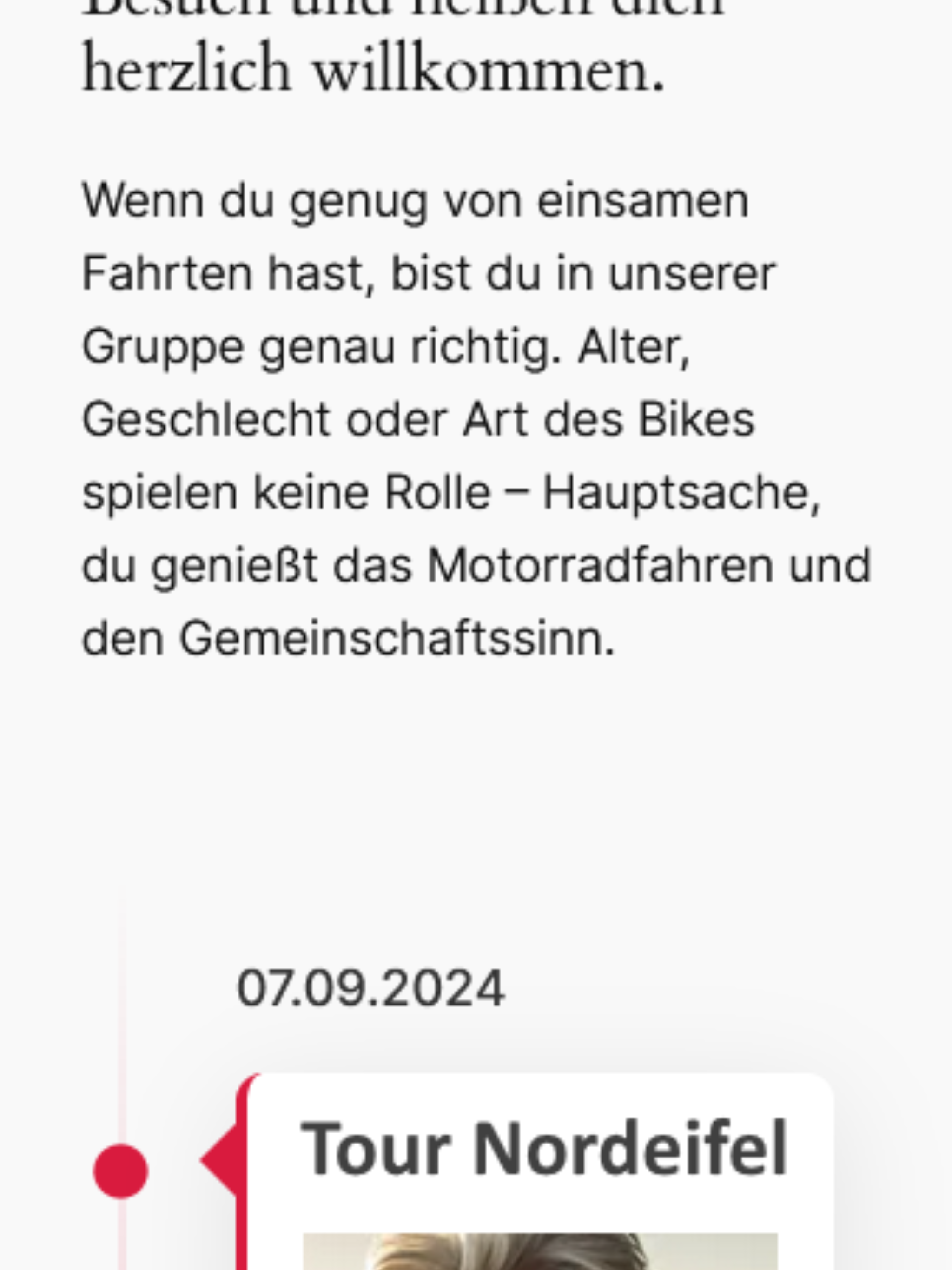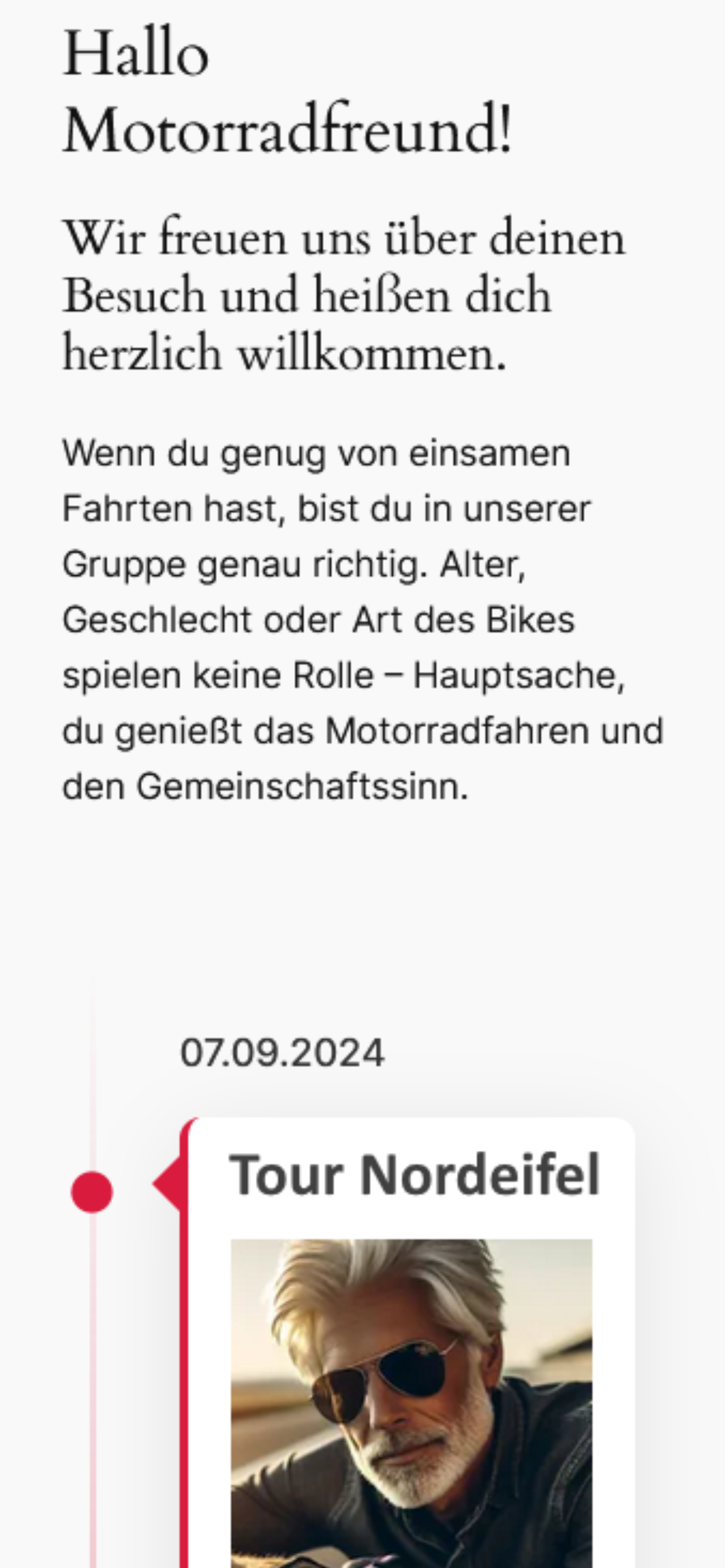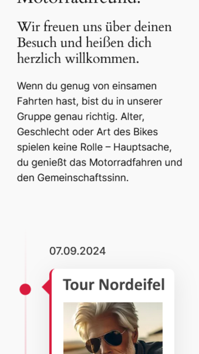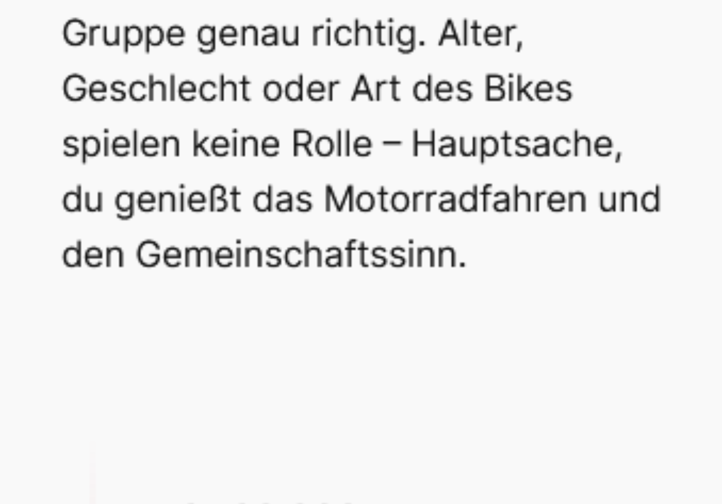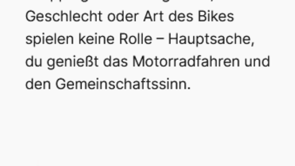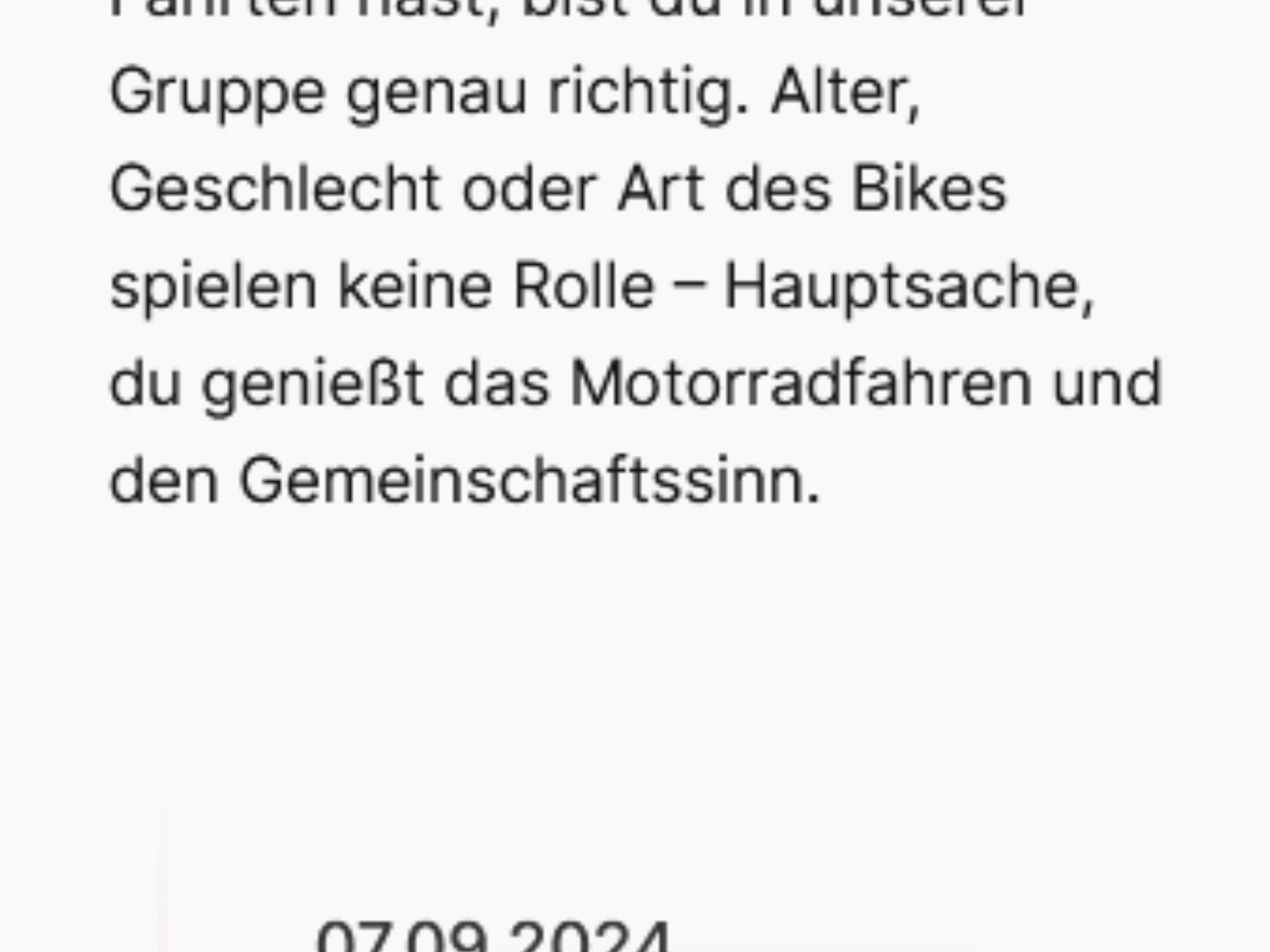 Wenn du genug von einsamen Fahrten hast, bist du in unserer Gruppe genau richtig. Alter, Geschlecht oder Art des Bikes spielen keine Rolle – Hauptsache, du genießt das Motorradfahren und den Gemeinschaftssinn.